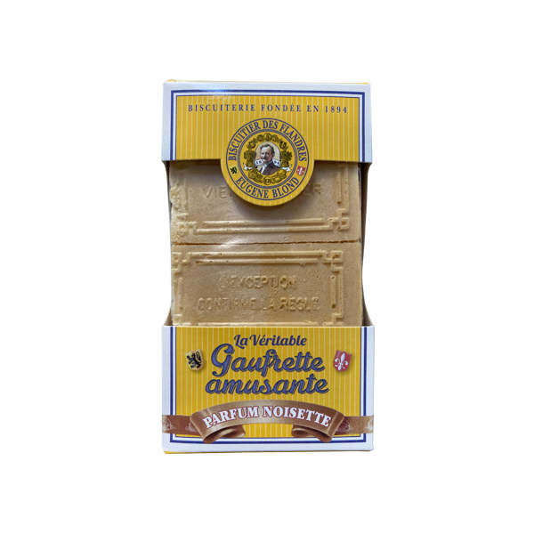 Les véritables gaufrettes amusantes fourrées à la noisette de La biscuiterie des Flandres Eugène Blond. Présentées dans une jolie boîte à « l’ancienne » découvrez des biscuits craquants avec sur chaque gâteau un délicieux petit message.