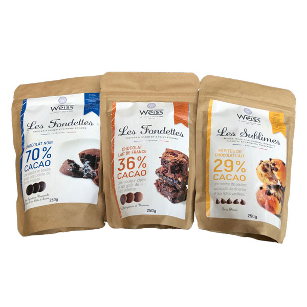 Présentées en sachets refermables et recyclables de 250 g, ce produit extrêmement fondant est simple d’utilisation. Ces petites « pépites » de chocolat sont faciles à intégrer à vos recettes car spécialement pensée pour la patisserie. Les pastilles de chocolat sont simples à doser et à faire fondre tandis que les pépites de chocolat tiennent parfaitement la chaleur sans perdre leur croquant.
