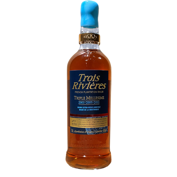 Elaboré selon les strictes règles de l’AOC Martinique, grâce au savoir-faire et à l’esprit pionnier du Maître de Chai, Trois Rivières Triple Millésime est un très vieux rhum agricole. Il s’illustre par l’onctuosité de sa structure et par une bouche délicate et ronde. Cette cuvée est issue de l’assemblage de 3 grands crus d’exception de la plantation Trois Rivières : les millésimes 2001, 2005 et 2011. Ces rhums, d’un âge moyen de 12 ans, ont vieilli dans des fûts de Bourbon ou dans des fûts neufs en bois de chêne français et américain. Il en ressort des notes de poivre, épices et fruits confits.